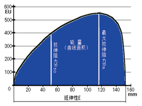 • 延伸性E:从拉面钩接触面团开始至至面团被拉断,拉伸曲线横坐标的距离,单位:mm
