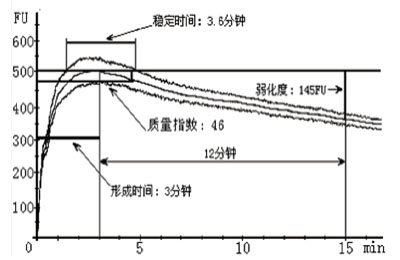 • 弱化度 粉质曲线中间值自峰值至12分钟时衰降的高度,单位:粉质仪单位(FU)