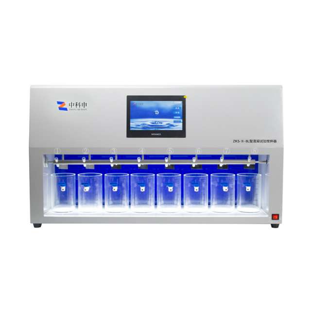 ZKS-II-8L 型混凝试验搅拌器是水处理领域常用的一种水处理专用试验仪器,用于水处理过程的烧杯试验,模拟水处理运行(自来水净化或者污水处理)中的加药、反应、絮凝、沉淀过程,试验结果放大应用到生产装置中,在水厂实践生产中起到了重要的指导意义。ZKS-II-8L型混凝试验搅拌器拥有自动测算G值与GT值功能。